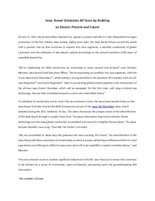 L'évolution de la marque Jeep s'est accélérée en cette année du 80e anniversaire avec l'arrivée des modèles 4xe, l'utilisation de l’électrification pour développer et produire les véhicules 4x4 les plus performants, amusants et avancés au monde, y compris le tout nouveau Jeep Grand Cherokee, qui sera présenté au Salon international de l'auto de New York 2021.