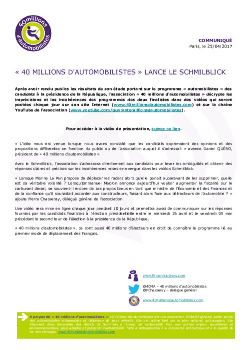 Après avoir rendu publics les résultats de son étude portant sur le programme « automobilistes » des candidats à la présidence de la République, l'association " 40 millions d'automobilistes " décrypte les imprécisions et les incohérences des programmes des deux finalistes dans des vidéos qui seront postées chaque jour sur son site Internet (www.40millionsdautomobilistes.com) et sur la chaîne YouTube de l'association (www.youtube.com/quarantemillionsdautomobilistes).
