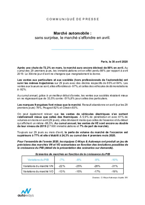 Après une chute de 72,2% en mars, le marché aura encore dévissé de 88% en avril. Au cumul des 29 premiers jours, les immatriculations ont en effet perdu 88% par rapport à avril 2019. Le 30è jour d’avril ne changera que marginalement la donne. Les ventes aux particuliers et aux sociétés (hors professionnels de l’automobile) ont suivi les mêmes trajectoires sur 29 jours avec des déclins respectifs de 85% et 84%...