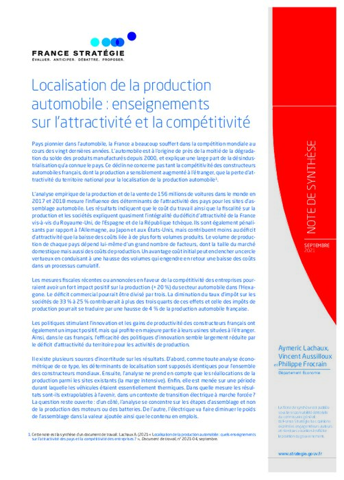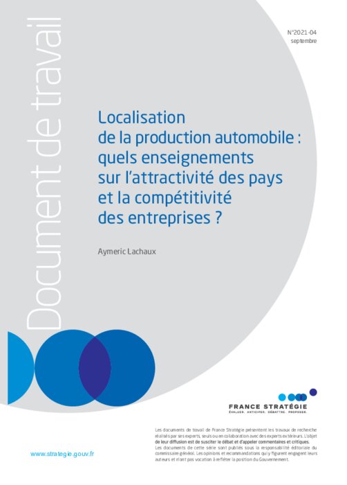 Pays pionnier dans l'automobile, la France a beaucoup souffert dans la compétition mondiale au cours des vingt dernières années. L'automobile est à l'origine de près de la moitié de la dégradation du solde des produits manufacturés depuis 2000, et explique une large part de la désindustrialisation qu'a connue le pays. Dans cette note, France Stratégie étudie l'influence des principaux déterminants de l'attractivité des pays pour la production automobile...