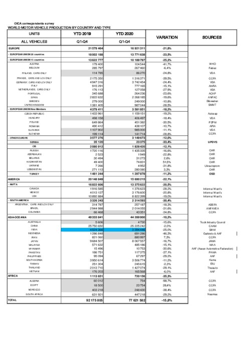 La crise sanitaire de 2020 a succédé à une année 2019 en léger ralentissement déjà, avec 92,2 millions de voitures, camions et bus produits (-5% sur un an). Avec les problèmes d'approvisionnement en pièces que rencontre l'industrie, notamment en semi-conducteurs, le premier semestre 2021 pourrait également être au ralenti.