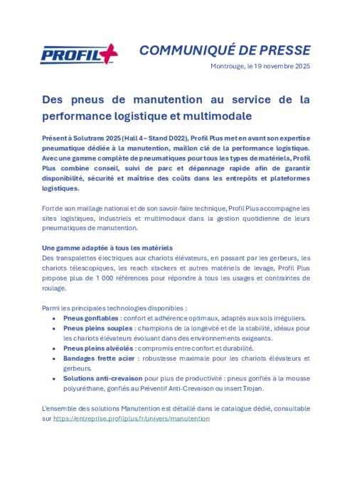 Profil Plus met en avant son expertise pneumatique dédiée à la manutention, maillon clé de la performance logistique. Avec une gamme complète de pneumatiques pour tous les types de matériels, Profil Plus combine conseil, suivi de parc et dépannage rapide afin de garantir disponibilité, sécurité et maîtrise des coûts dans les entrepôts et plateformes logistiques. Fort de son maillage national et de son savoir-faire technique, Profil Plus accompagne les sites logistiques, industriels et multimodaux dans la gestion quotidienne de leurs pneumatiques de manutention.
