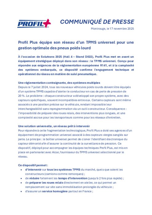 À l’occasion de Solutrans 2025 (Hall 4 – Stand D022), Profil Plus met en avant un équipement stratégique déployé dans son réseau : le TPMS universel. Conçu pour répondre aux exigences de la réglementation européenne R141, et à la complexité des systèmes embarqués, ce dispositif confirme l'engagement technique et opérationnel du réseau en matière de suivi pneumatique.