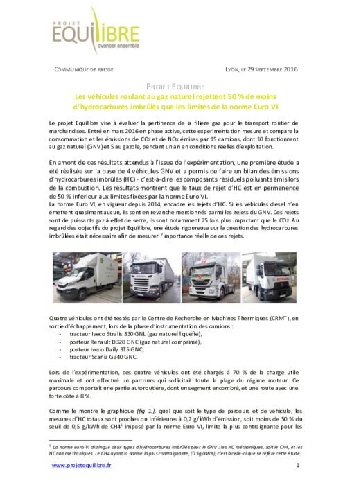 Le projet Equilibre vise à évaluer la pertinence de la filière gaz pour le transport routier de marchandises. Entré en mars 2016 en phase active, cette expérimentation mesure et compare la consommation et les émissions de CO2 et de NOx émises par 15 camions, dont 10 fonctionnant au gaz naturel (GNV) et 5 au gazole, pendant un an en conditions réelles d'exploitation.