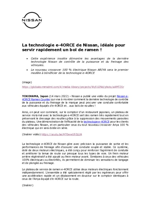 Nissan a publié une vidéo du projet Nissan e-4ORCE Ramen Counter qui vise à montrer comment la dernière technologie de contrôle de la puissance et du freinage de la marque peut procurer une conduite confortable aux véhicules équipés d'e-4ORCE et… aux bols de nouilles !