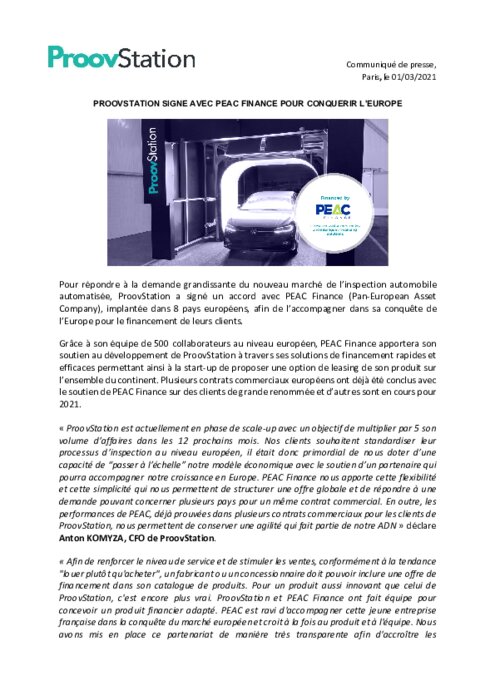 Pour répondre à la demande grandissante du nouveau marché de l'inspection automobile automatisée, ProovStation a signé un accord avec PEAC Finance (Pan-European Asset Company), implantée dans 8 pays européens, afin de l'accompagner dans sa conquête de l'Europe pour le financement de leurs clients.