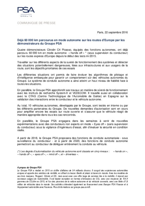Quatre démonstrateurs Citroën C4 Picasso, équipés des fonctions autonomes, ont déjà parcouru 60 000 km en mode autonome " hands off "(sous supervision du conducteur) sur les routes express d’Europe depuis le début des tests mi 2015. Travailler sur les différents aspects de la sûreté de fonctionnement des systèmes et détecter des situations potentiellement dangereuses, liées aux infrastructures et aux usagers de la route, sont les objectifs prioritaires de ces essais.