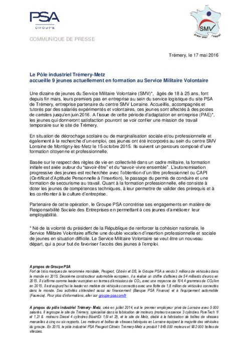 Une dizaine de jeunes du Service Militaire Volontaire (SMV), âgés de 18 à 25 ans, font depuis fin mars, leurs premiers pas en entreprise au sein du service logistique du site PSA de Trémery, entreprise partenaire du centre SMV Lorraine. Accueillis, accompagnés et tutorés par des salariés expérimentés et volontaires, ces jeunes sont affectés à des postes de caristes jusqu’en juin 2016.