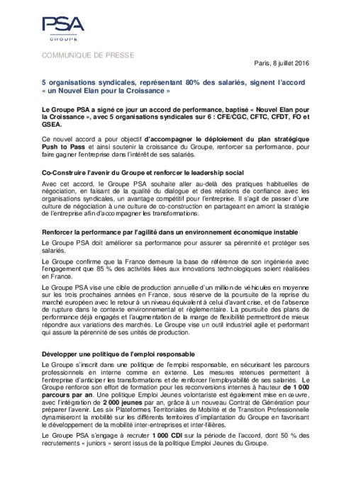 Cet accord baptisé "Nouvel élan pour la croissance" a reçu l'aval de cinq organisations (FO, CFE-CGC, CFTC et SIA-GSEA, CFDT), représentant 80% du personnel, ce qui montre la "relation de confiance avec les partenaires sociaux", a souligné Xavier Chéreau, directeur des Ressources humaines du groupe PSA. Selon lui, il s'agit d'"un acte suffisamment rare pour être signalé".