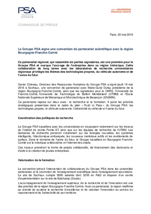 PSA a signé jeudi soir à Sochaux une "convention de partenariat scientifique" avec trois établissements d'enseignement supérieur de Bourgogne-Franche-Comté: l'université de Franche-Comté, l'université de technologie de Belfort-Montbéliard (UTBM) et l'Ecole nationale supérieure de mécanique et des microtechniques de Besançon (ENSMM), a annoncé le groupe dans un communiqué.