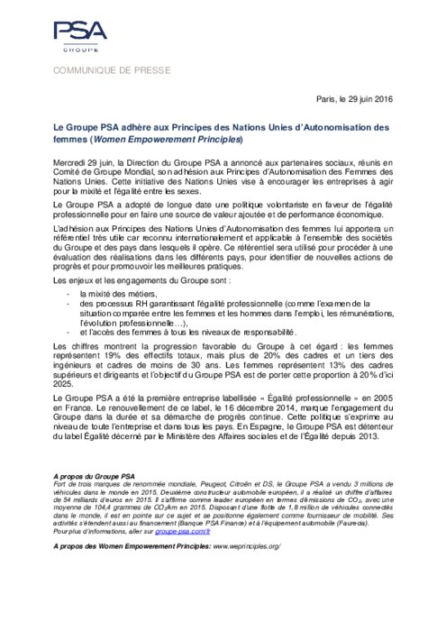 Mercredi 29 juin, la Direction du Groupe PSA a annoncé aux partenaires sociaux, réunis en Comité de Groupe Mondial, son adhésion aux Principes d’Autonomisation des Femmes des Nations Unies. Cette initiative des Nations Unies vise à encourager les entreprises à agir pour la mixité et l’égalité entre les sexes.
