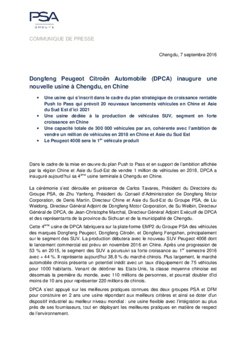 PSA et son partenaire Dongfeng Motors, deuxième constructeur chinois, ont dévoilé dans la capitale du Sichuan (sud-ouest) le nouveau site industriel de leur coentreprise DPCA.