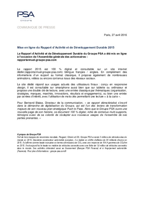 Le Rapport d’Activité et de Développement Durable du Groupe PSA a été mis en ligne à l’occasion de l’Assemblée générale des actionnaires : rapportannuel.groupe-psa.com. Le rapport 2015 est 100 % digital et consultable sur un site internet dédié (rapportannuel.groupe-psa.com) bilingue français / anglais. En complément des informations d’un rapport au format classique, il propose également de nombreuses animations, vidéos ou encore contenus issus des réseaux sociaux.