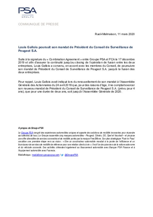 "Afin d'assurer la continuité jusqu'au closing de l'opération de fusion entre les deux entreprises, Louis Gallois a convenu (...) de poursuivre son mandat de président du conseil de surveillance de Peugeot S.A. jusqu'à la fusion des deux entreprises", a annoncé le groupe français dans un communiqué.