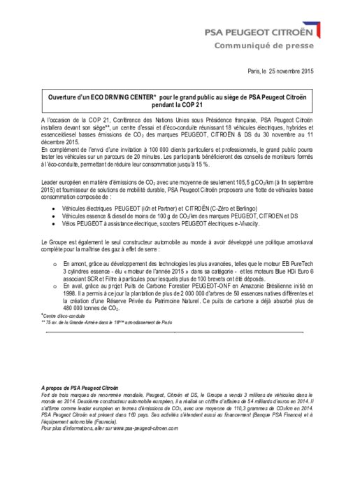 A l’occasion de la COP 21, Conférence des Nations Unies sous Présidence française, PSA Peugeot Citroën installera devant son siège, un centre d’essai et d’éco-conduite réunissant 18 véhicules électriques, hybrides et essence/diesel basses émissions de CO2 des marques PEUGEOT, CITROËN & DS du 30 novembre au 11 décembre 2015.
