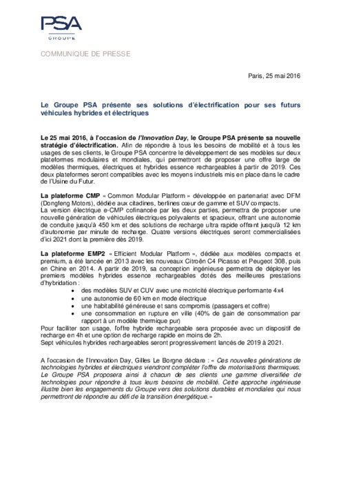 Le 25 mai 2016, à l'occasion de l'Innovation Day, le Groupe PSA présente sa nouvelle stratégie d'électrification. Afin de répondre à tous les besoins de mobilité et à tous les usages de ses clients, le Groupe PSA concentre le développement de ses modèles sur deux plateformes modulaires et mondiales, qui permettront de proposer une offre large de modèles thermiques, électriques et hybrides essence rechargeables à partir de 2019.