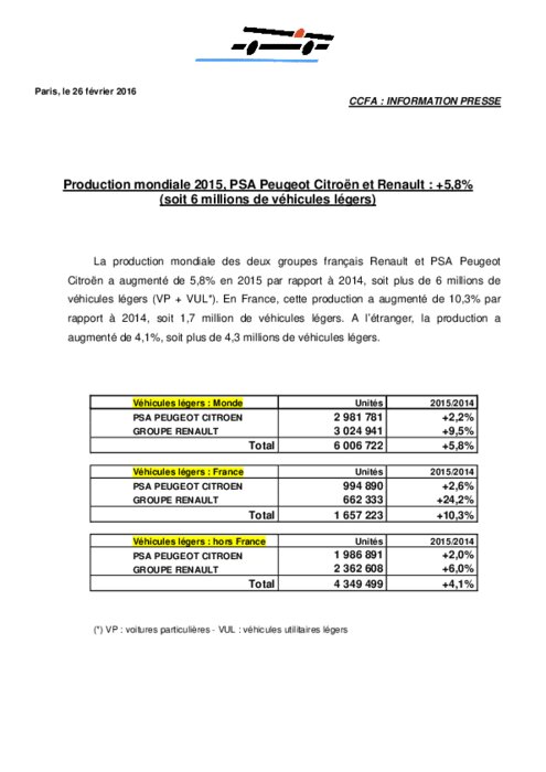 La production mondiale des deux groupes français Renault et PSA Peugeot Citroën a augmenté de 5,8% en 2015 par rapport à 2014, soit plus de 6 millions de véhicules légers (VP + VUL). En France, cette production a augmenté de 10,3% par rapport à 2014, soit 1,7 million de véhicules légers. A l’étranger, la production a augmenté de 4,1%, soit plus de 4,3 millions de véhciules légers.