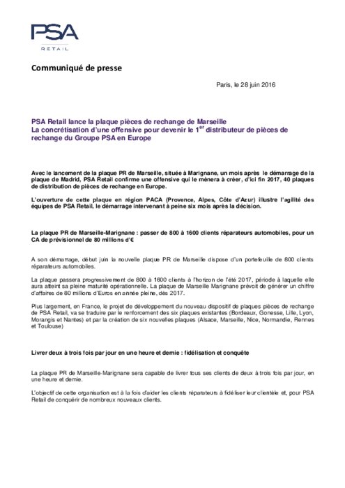 Avec le lancement de la plaque Pièces de Rechange de Marseille, située à Marignane, un mois après le démarrage de la plaque de Madrid, PSA Retail confirme une offensive qui le mènera à créer, d’ici fin 2017, 40 plaques de distribution de pièces de rechange en Europe(*). L’ouverture de cette plaque en région PACA (Provence, Alpes, Côte d’Azur) illustre l’agilité des équipes de PSA Retail, le démarrage intervenant à peine six mois après la décision.
