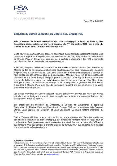 Le changement de poste de M. Olivier (X-Mines), entré chez PSA en 2007, entraîne des évolutions en chaîne dans le comité exécutif. Denis Martin lui succède en Asie, laissant la direction Europe qui échoit à Maxime Picat, jusqu'alors directeur général de Peugeot, et qui rentre au directoire.