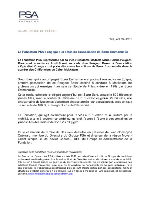 La Fondation PSA, représentée par sa Vice-Présidente Madame Marie-Hélène Peugeot-Roncoroni, a remis ce lundi 9 mai les clefs d’un Peugeot Boxer à l’association « Opération Orange » qui porte désormais les actions de Sœur Emmanuelle dans le quartier des Chiffonniers du Caire, Mokkatam.