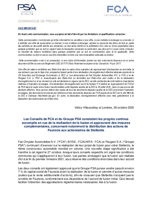 Les deux conseils ont également approuvé que PSA vendrait "jusqu'à environ 7% du capital social" de l'équipementier Faurecia "avant la réalisation de la fusion", soit environ 350 millions d'euros selon la valeur de l'action mercredi. Stellantis garderait ainsi 39% de Faurecia.