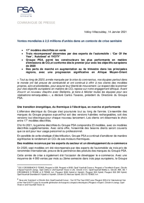 Parmi les entités du groupe, c'est Peugeot qui a le mieux résisté en 2020 (-23% à 1,1 million de ventes) et Opel Vauxhall qui a été la plus pénalisée par la crise sanitaire (-35% à environ 630.000).