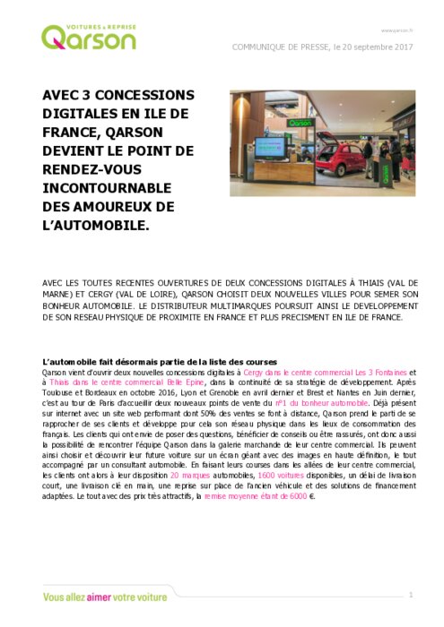 Qarson vient d’ouvrir deux nouvelles concessions digitales à Cergy dans le centre commercial Les 3 Fontaines et à Thiais dans le centre commercial Belle Epine, dans la continuité de sa stratégie de développement. Après Toulouse et Bordeaux en octobre 2016, Lyon et Grenoble en avril dernier et Brest et Nantes en Juin dernier, c’est au tour de Paris d’accueillir deux nouveaux points de vente du n°1 du bonheur automobile. Déjà présent sur internet avec un site web performant dont 50% des ventes se