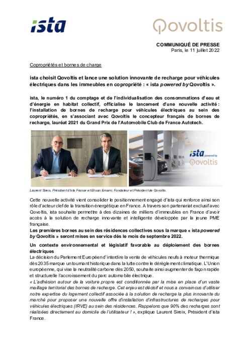 ista, le numéro 1 du comptage et de l’individualisation des consommations d’eau et d’énergie en habitat collectif, officialise le lancement d’une nouvelle activité : l’installation de bornes de recharge pour véhicules électriques au sein des copropriétés, en s’associant avec Qovoltis le concepteur français de bornes de recharge, lauréat 2021 du Grand Prix de l’Automobile Club de France Autotech.