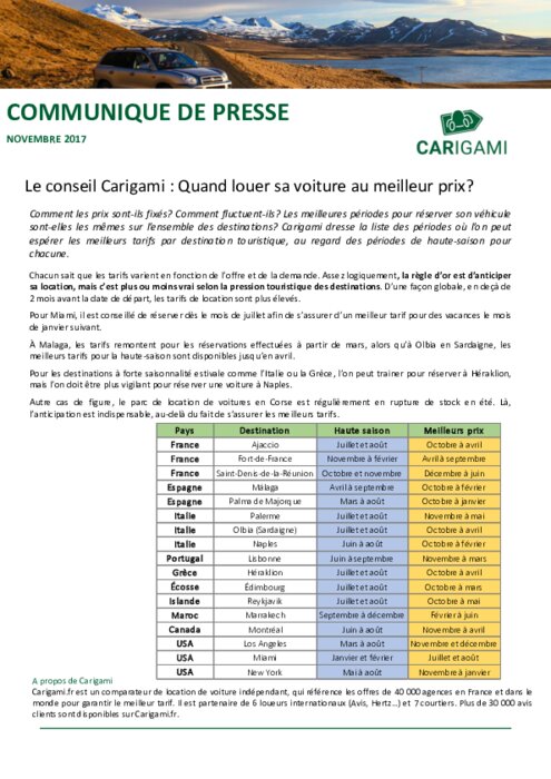 Comment les prix sont-ils fixés? Comment fluctuent-ils? Les meilleures périodes pour réserver son véhicule sont-elles les mêmes sur l'ensemble des destinations ? Carigami dresse la liste des périodes où l'on peut espérer les meilleurs tarifs par destination touristique, au regard des périodes de haute-saison pour chacune.