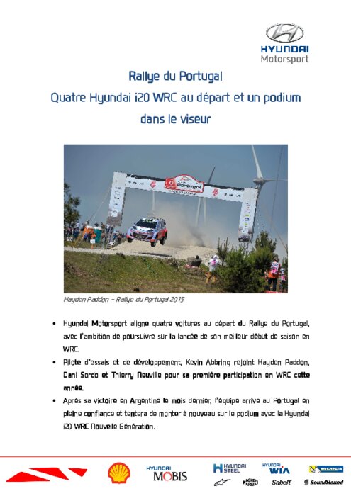 Hyundai aligne 4 voitures au départ du Rallye du Portugal, cinquième épreuve du calendrier 2016 du Championnat du Monde des Rallyes FIA (WRC), avec l’objectif de poursuivre le meilleur début de saison réalisé depuis l’arrivée de l’équipe dans la discipline. Pilote d’essais et de développement, Kevin Abbring disputera son premier rallye mondial de la saison avec son copilote Seb Marshall, aux commandes d’une Hyundai i20 WRC version 2015 identique à celle utilisée par Hayden Paddon à Monte-Carlo.