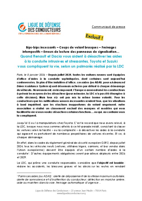 Depuis juillet 2024, toutes les voitures neuves sont équipées d’office d’aides à la conduite sophistiquées, dont certaines sont aujourd’hui controversées. En plus d’être installées d’office, ces aides (ou ADAS, pour « Advanced Driver Assistance System ») sont désormais activées par défaut à chaque démarrage du véhicule. Heureusement, en les imposant, l’Europe a aussi autorisé les constructeurs à prévoir les moyens de les désactiver (pour mémoire, la LDC n’a pas été étrangère à cette décision). Mais tous n’y ont pas mis la même bonne volonté. Pour les conducteurs que les notifications sonores incessantes rendent fous, que les vibrations à bord inquiètent, que les réactions inopportunes du volant angoissent, notre association a réalisé un classement exclusif des marques et modèles qui vous facilitent la vie si vous voulez désactiver certaines fonctions… ou qui, au contraire vous la compliquent.