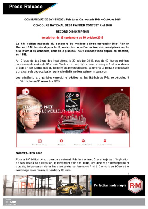 La 13e édition nationale du concours du meilleur peintre carrossier Best Painter Contest R-M, lancée depuis le 15 septembre avec lʼouverture des inscriptions sur le site internet du concours, connaît le plus haut taux dʼinscriptions depuis sa création, en 1999.