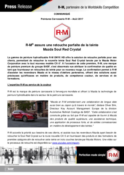La gamme de peinture hydrodiluable R-M ONYX HD offre la solution de retouche parfaite pour ses clients, permettant de retoucher la nouvelle teinte Soul Red Crystal lancée par la Mazda Motor Corporation avec le tout nouveau modèle CX-5. À l'occasion de cette première, R-M, une marque de peinture premium du groupe BASF, s'est désormais vue attribuer la confirmation de qualité en tant que fournisseur en retouches de teinte pour ce nouveau rouge.