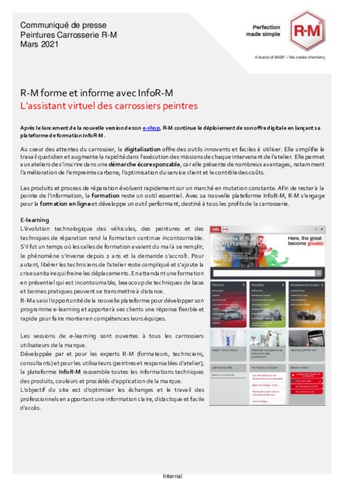 Après le lancement de la nouvelle version de son e-shop, R-M continue le déploiement de son offre digitale en lançant sa plateforme de formation InfoR-M. Au cœur des attentes du carrossier, la digitalisation offre des outils innovants et faciles à utiliser. Elle simplifie le travail quotidien et augmente la rapidité dans l‘exécution des missions de chaque intervenant de l‘atelier. Elle permet aux ateliers de s’inscrire dans une démarche écoresponsable, car elle présente de nombreux avantages...
