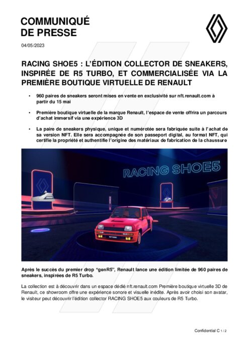 Constructeurs 04 mai 2023 - 10:14 960 paires de sneakers seront mises en vente en exclusivité sur nft.renault.com à partir du 15 mai. PDF (360 Ko) Télécharger