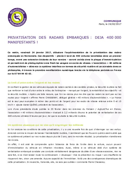 L’expérimentation de la privatisation des radars embarqués en Normandie a débuté vendredi 24 janvier 2017. Ces dispositifs – placés à bord de 440 voitures banalisées dans un premier temps, sont cachés dans la plaque d’immatriculation et permettront de photographier sans flash les usagers en excès de vitesse. L’association 40MA dénonce ce système interface en termes de sécurité routière et ce scandale dans sa philosophie à travers la 1ère manifestation numérique lancée via le 07 89 99 63 63.