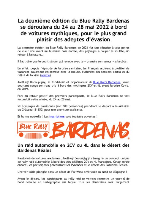 Passionné de voitures anciennes, Jeoffrey Decoupigny a imaginé un concept unique de rally-raid automobile à bord des très célèbres 2CV et 4L françaises. Cette année encore, les participants parcourront les Pyrénées et le désert des Bardenas Reales. Une véritable plongée dans un décor de Far West américain au nord de l'Espagne.