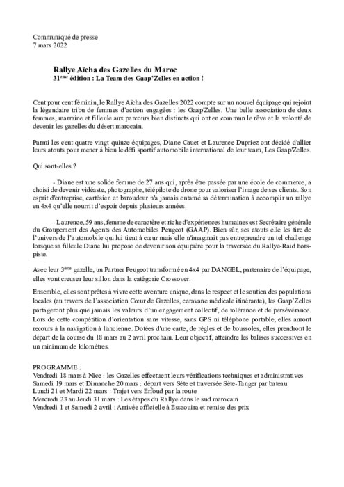 Cent pour cent féminin, le Rallye Aïcha des Gazelles 2022 compte sur un nouvel équipage qui rejoint la légendaire tribu de femmes d’action engagées : les Gaap'Zelles. Une belle association de deux femmes, marraine et filleule aux parcours bien distincts qui ont en commun le rêve et la volonté de devenir les gazelles du désert marocain. Parmi les cent quatre vingt quinze équipages, Diane Cauet et Laurence Dupriez ont décidé d'allier leurs atouts pour mener à bien le défi sportif automobile...