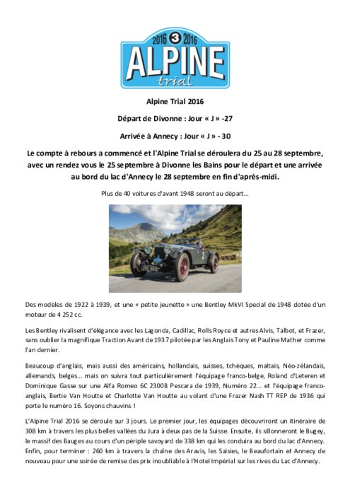 Services 30 août 2016 - 16:44 Le compte à rebours a commencé et l'Alpine Trial se déroulera du 25 au 28 septembre, avec un rendez vous le 25 septembre à Divonne les Bains pour le départ et une arrivée au bord du lac d'Annecy le 28 septembre en fin d'après-midi. PDF (504 Ko) Télécharger