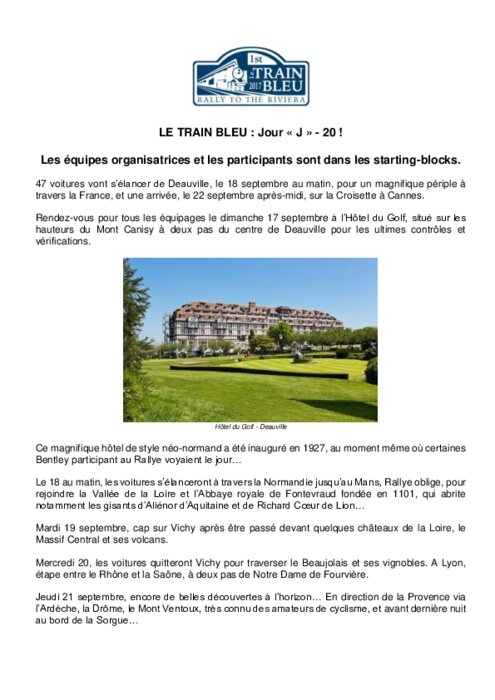 Les équipes organisatrices et les participants sont dans les starting-blocks. 47 voitures vont s’élancer de Deauville, le 18 septembre au matin, pour un magnifique périple à travers la France, et une arrivée, le 22 septembre après-midi, sur la Croisette à Cannes. Rendez-vous pour tous les équipages le dimanche 17 septembre à l’Hôtel du Golf, situé sur les hauteurs du Mont Canisy à deux pas du centre de Deauville pour les ultimes contrôles et vérifications.