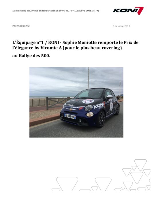 Equipementiers 10 octobre 2017 - 14:25 L’Équipage n°1 / KONI avec Sophie Moniotte remporte le Prix de l’élégance by Vicomte A (pour le plus beau covering) au Rallye des 500. PDF (2 Mo) Télécharger