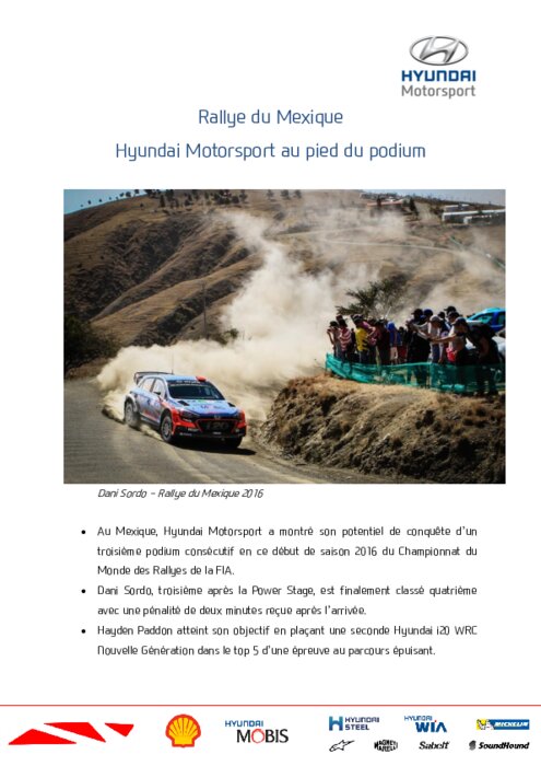 Déjà sur le podium à l’arrivée du Rallye Monte-Carlo avec Thierry Neuville et Nicolas Gilsoul et du Rallye de Suède avec Hayden Paddon et John Kennard, Hyundai Motorsport avait l’ambition de conquérir un nouveau top 3 lors de la première manche sur terre de la saison. Dani Sordo et Marc Martí avaient atteint cet objectif avec une troisième place à l’arrivée de l’ES21, avant d’être pénalisés...