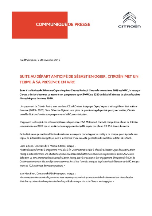 "Suite à la décision de Sébastien Ogier de quitter Citroën Racing à l'issue de cette saison 2019 en Championnat du monde des rallyes, Citroen a décidé de mettre un terme à son programme sportif en WRC (en) 2020 du fait de l'absence de pilote de pointe disponible pour la saison 2020", a écrit l'équipe française sur Twitter.