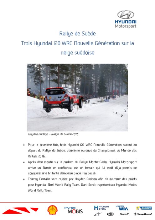 Après être monté sur le podium du Rallye Monte-Carlo, manche inaugurale de cette saison 2016 du Championnat du Monde des Rallyes de la FIA (WRC), Hyundai Motorsport prépare le Rallye de Suède. Pour la première fois, trois Hyundai i20 WRC Nouvelle Génération seront alignées au départ. La Hyundai i20 WRC Nouvelle Génération a réussi ses débuts en compétition entre Gap et Monaco : Hyundai Motorsport a signé ses premiers meilleurs temps sur le Rallye Monte-Carlo.