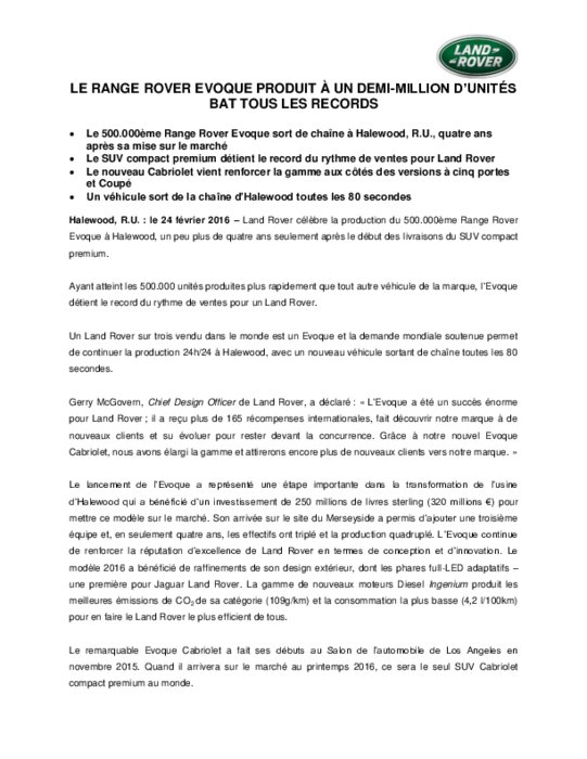 Land Rover célèbre la production du 500.000ème Range Rover Evoque à Halewood, un peu plus de quatre ans seulement après le début des livraisons du SUV compact premium. Ayant atteint les 500.000 unités produites plus rapidement que tout autre véhicule de la marque, l’Evoque détient le record du rythme de ventes pour un Land Rover.