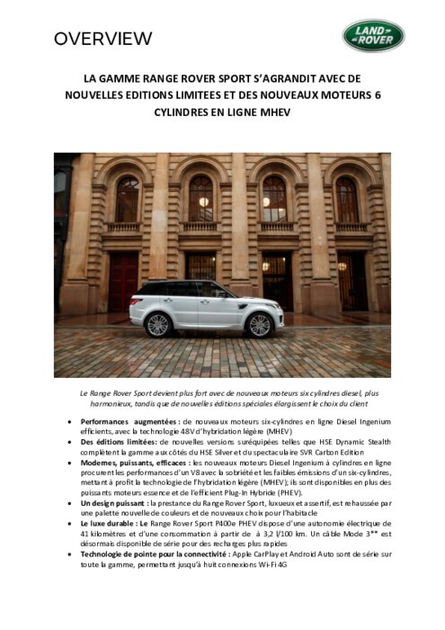 Constructeurs 15 juillet 2020 - 17:27 Le Range Rover Sport devient plus fort avec de nouveaux moteurs six cylindres diesel, plus harmonieux, tandis que de nouvelles éditions spéciales élargissent le choix du client. PDF (577 Ko) Télécharger