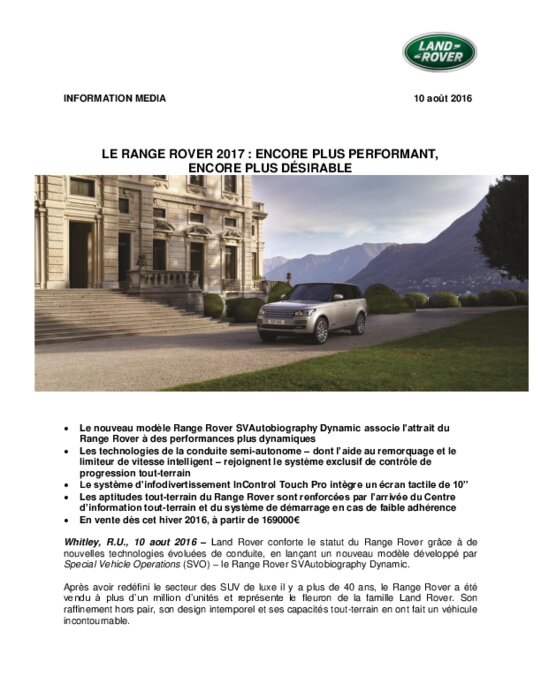 Land Rover conforte le statut du Range Rover grâce à de nouvelles technologies évoluées de conduite, en lançant un nouveau modèle développé par Special Vehicle Operations (SVO) – le Range Rover SVAutobiography Dynamic. Après avoir redéfini le secteur des SUV de luxe il y a plus de 40 ans, le Range Rover a été vendu à plus d’un million d’unités et représente le fleuron de la famille Land Rover.