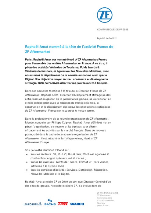 Raphaël Amat est nommé Head of ZF Aftermarket France pour l’ensemble des entités Aftermarket en France. À ce titre, il pilote les activités Véhicules de Tourisme, Poids Lourds & Véhicules Industriels, et également les Nouvelles Mobilités, avec notamment le déploiement de la navette autonome ainsi que le Digital. Son objectif à moyen terme : construire et développer la stratégie 2030 de l’activité Aftermarket pour le marché français.