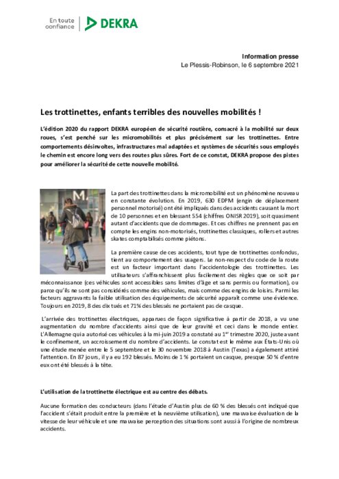 L’édition 2020 du rapport DEKRA européen de sécurité routière, consacré à la mobilité sur deux roues, s’est penché sur les micromobilités et plus précisément sur les trottinettes. Entre comportements désinvoltes, infrastructures mal adaptées et systèmes de sécurités sous employés le chemin est encore long vers des routes plus sûres. Fort de ce constat, DEKRA propose des pistes pour améliorer la sécurité de cette nouvelle mobilité.