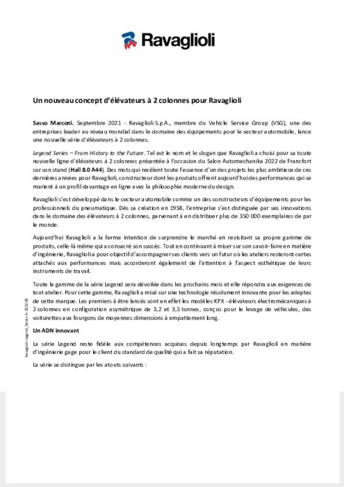 Equipementiers 09 septembre 2022 - 12:24 Ravaglioli S.p.A., membre du Vehicle Service Group (VSG), une des entreprises leader au niveau mondial dans le domaine des équipements pour le secteur automobile, lance une nouvelle série d’élévateurs à 2 colonnes. PDF (435 Ko) Télécharger